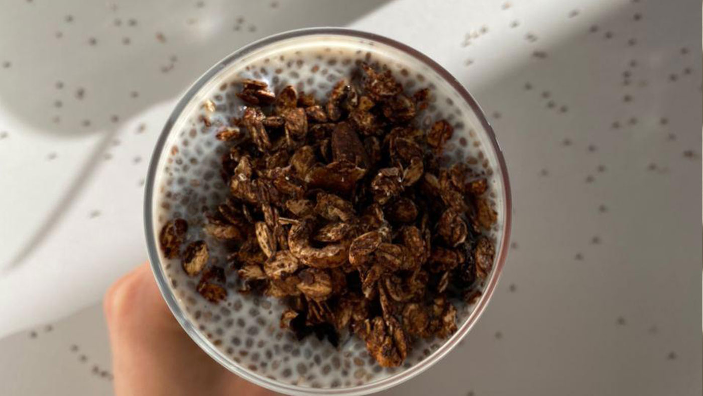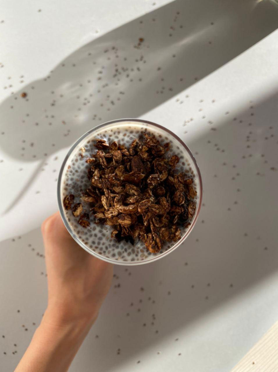 Dimineața, se asortează şi se serveşte cu granola din ciocolată.