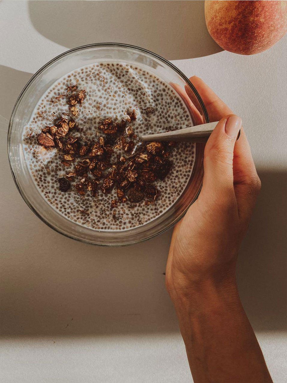 Se toarnă într-un bol un pahar de lapte, după preferință (normal sau de migdale, cocos sau ovăz), se adaugă semințe organice de chia, proporția 80/20.