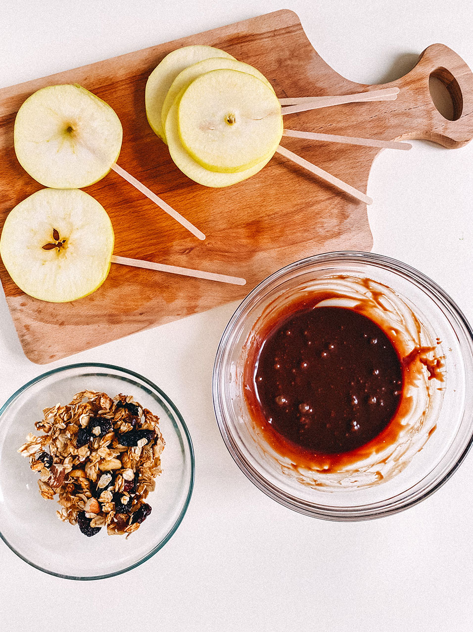 Cu mare atenție, introducem bețișorul în fiecare felie de măr tăiat.