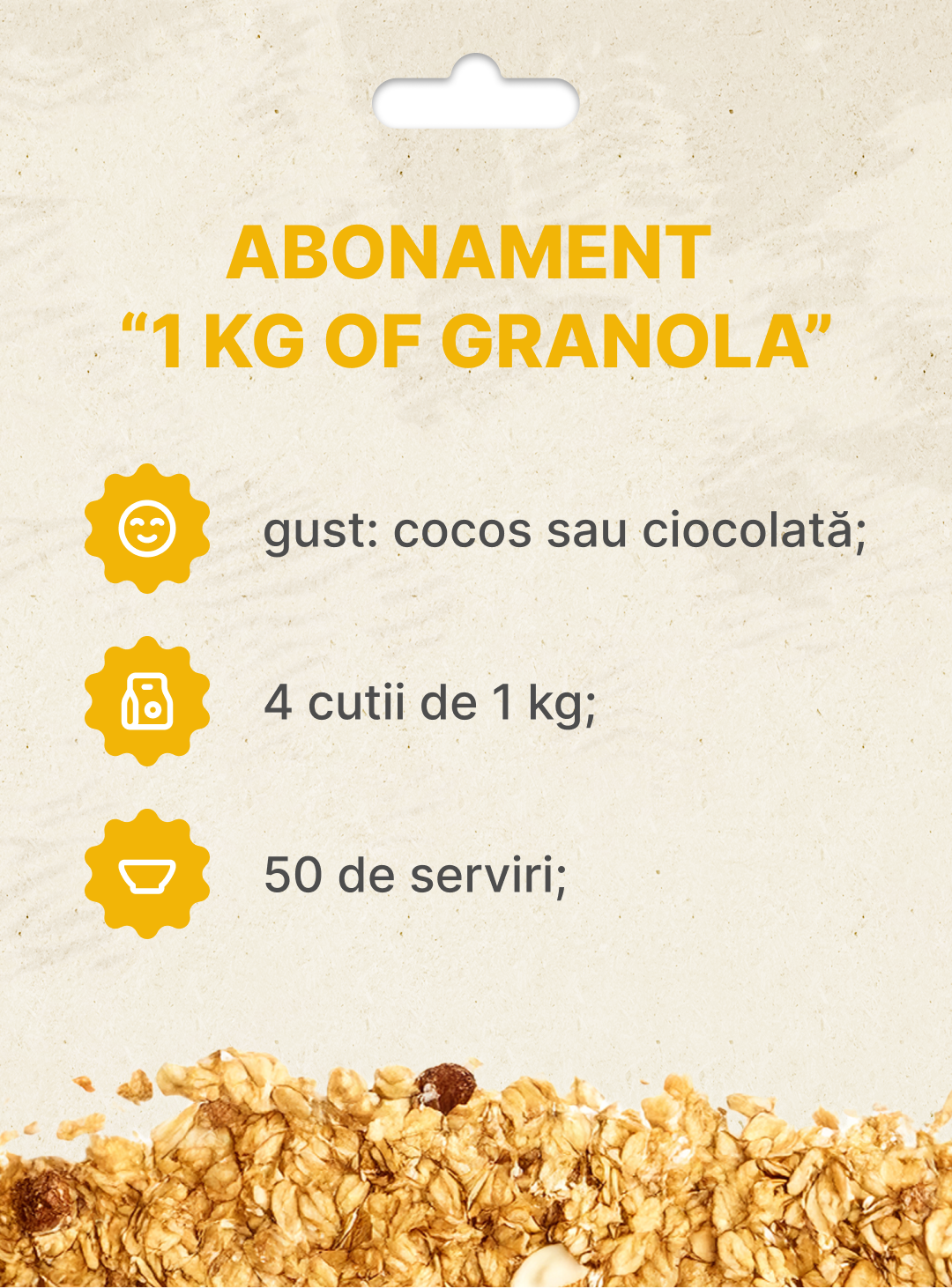 Acest abonament special este creat pentru acei consumatori care au îndrăgit un anumit gust cu cocos sau cu ciocolată și își doresc 4kg de granola proaspătă pe lună, aproximativ 50 de serviri, potrivit pentru familii numeroase sau companii.