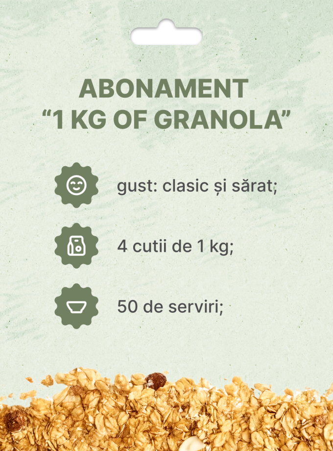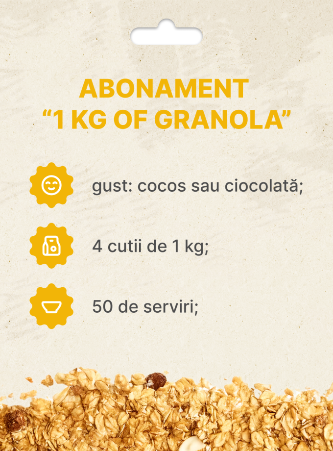 Cu abonamentul „For Me”, nu doar că primești granola proaspătă direct la ușa ta, dar ai libertatea de a alege oricare tip de granola preferi în fiecare lună – exact cum îți place ție!