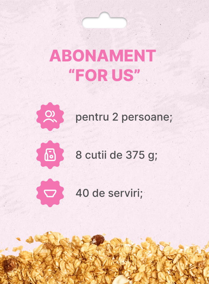 Abonamentul „For Me” este perfect pentru o persoană care vrea să aibă mereu la îndemână granola proaspătă și delicioasă. Pe lângă confortul de a primi 4 cutii de 375g lunar cu livrare gratuita in municipiul Chisinau, economisești 7% din prețul standard sau 40 de lei față de achizițiile individuale. Astfel, te bucuri de o gustare sănătoasă, iar tu economisești fără efort! Profită de această oportunitate și transformă-ți fiecare zi într-un mic dejun de neuitat!