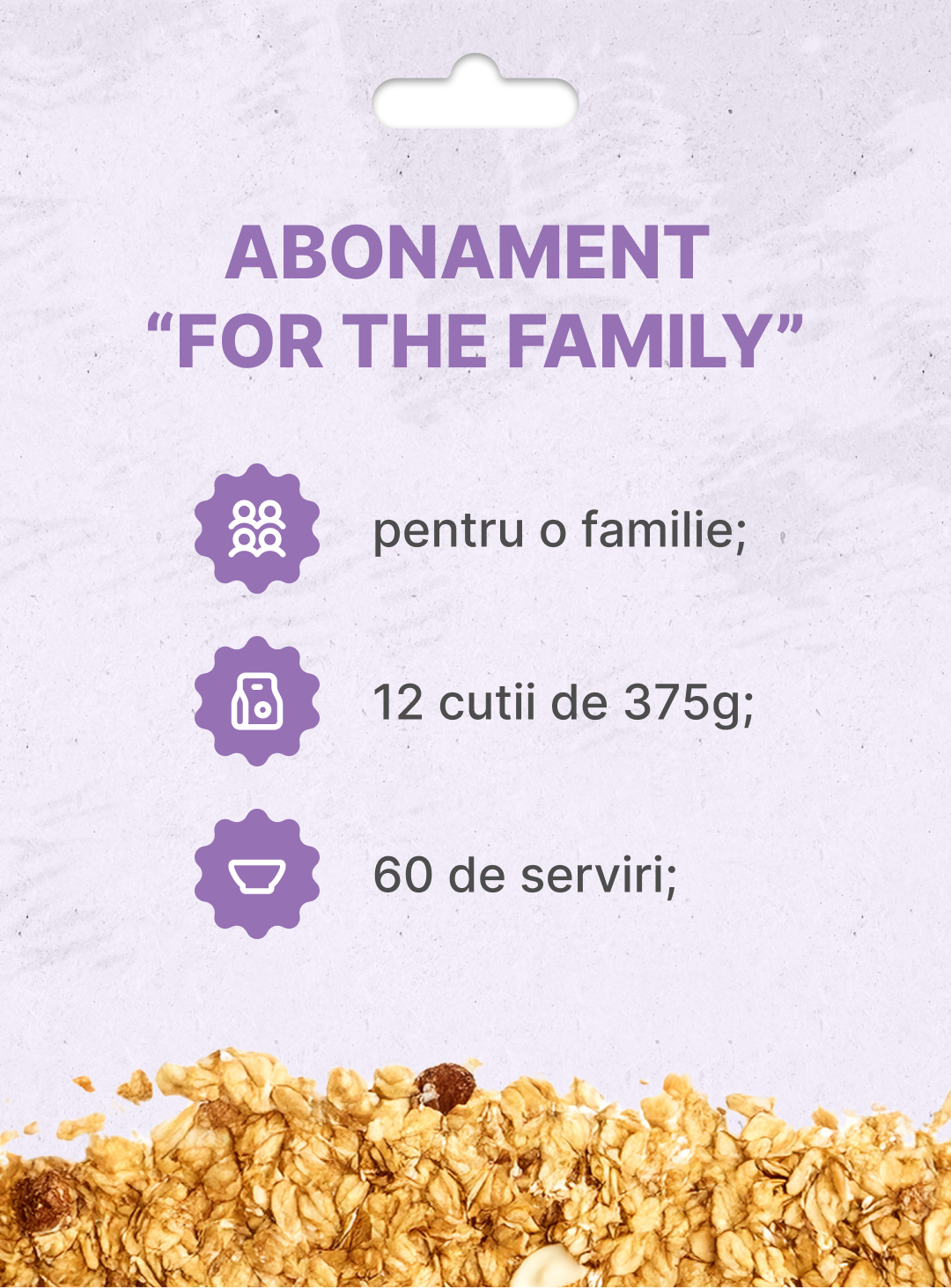 Abonamentul „For the Family” este perfect pentru familiile care iubesc granola noastră sau pentru companii care doresc să-și răsfețe echipa cu ceva sănătos. Include 12 cutii de 375g de granola proaspătă pe lună, echivalentul a aproximativ 60 de porții – suficient pentru a satisface pofta unei familii numeroase sau pentru a aduce un strop de energie la birou!