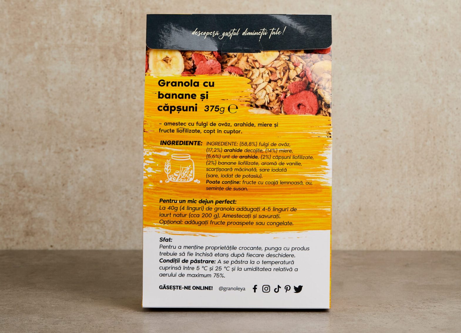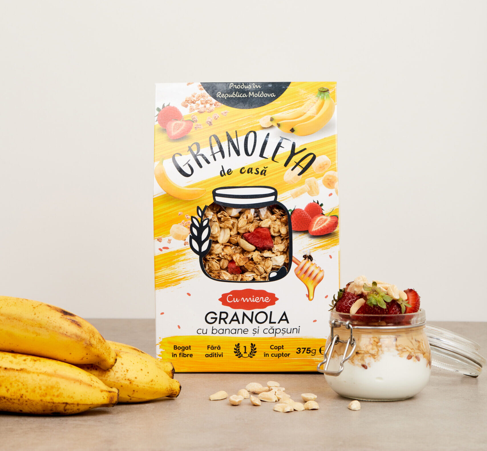 Granola cu banane și căpșuni liofilizate este o combinație extraordinar de reușită! Textura crocantă a arahidelor se îmbină perfect cu dulceața naturală a bananelor și căpșunilor. Este un gust dulce, dar într-o formă pură, care te cucerește imediat. Iar dacă o combini cu iaurt grecesc, vei descoperi un echilibru perfect între dulceață și prospețimea iaurtului, rezultând o gustare tare reușită! Fructele liofilizate sunt pur și simplu superbe – le-ai mai încercat? Dacă nu, nu știi ce pierzi!