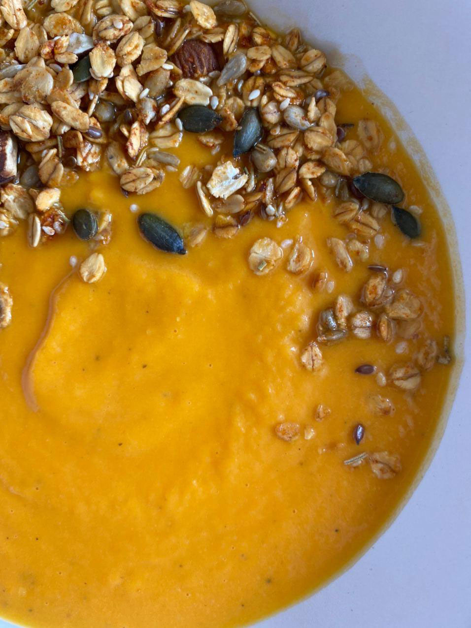 La final, adăugăm granola sărată şi servim această supă absolut delicioasă.